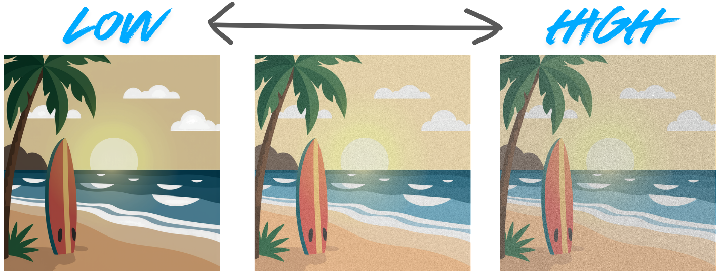 - Higher ISO = brighter image = more noise (grain)
